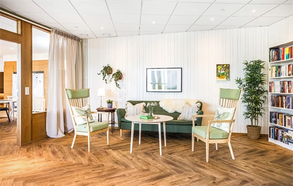 Boendet är utrustat med smarta tekniska lösningar för att skapa trygghet och trevnad för såväl boende som medarbetare. Till exempel har vi en belysningslösning som styrs helt automatiskt och som stöttar dygnsrytmen. I huset har vi komfortkyla som ger en behaglig inomhustemperatur året om.