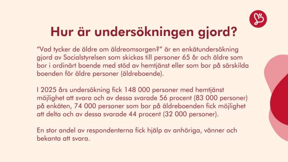 I 2025 års undersökning fick 148 000 personer med hemtjänst möjlighet att svara och av dessa svarade 56 procent (83 000 personer) på enkäten, 74 000 personer som bor på äldreboenden fick möjlighet att delta och av dessa svarade 44 procent (32 000 personer).