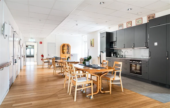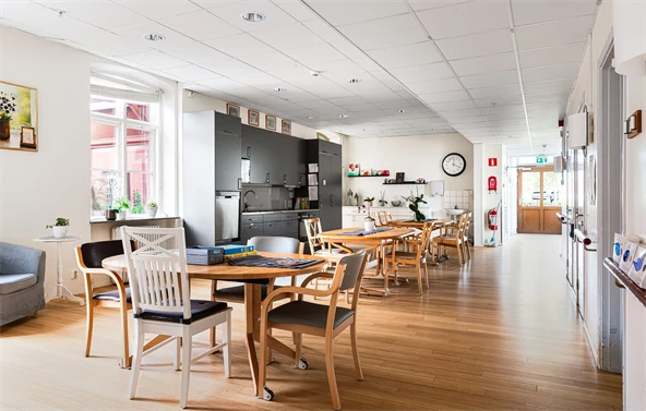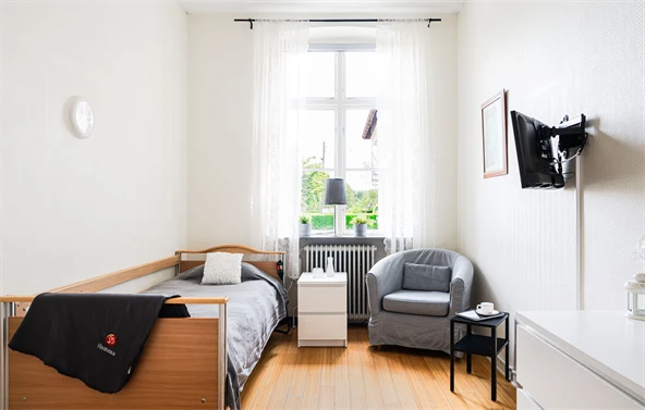 Hos oss har den enskilde möjlighet att själv möblera sitt rum. Vi arbetar med pedagogiska måltider, vilket innebär att personalen normalt äter tillsammans med de boende, men det finns också möjlighet att äta i det egna rummet, i allmänna utrymmen på avdelningen eller vid eget bord.