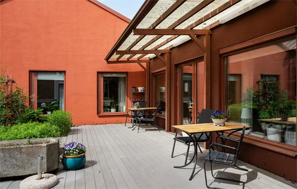 Här bor man i egna rum med gemensamma toaletter, duschar och en tvättstuga. Båda våningarna har tillgång till dagrum med TV och matsal där samtliga måltider serveras. Hiss finns mellan våningarna.